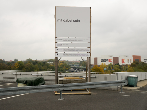 STADT IM REGAL reinvents the Happening FLUIDS from Alan Kaprow. Construction signs in the public space of Berlin cite words / word combinations of Kaprow's announcement of its original happenings 1967. The announcement included instructions for the erection of a rectangular enclosure, approximately 2.50 m high made of ice blocks. In the realized work ofSTADT IM REGAL, selected notions, freed from their previous descriptive context, become readable and imaginative scores for four different places in public space. Exhibition: 15th September to 8th November 2015, invited by Nationalgalerie Staatliche Museen zu Berlin, as part of the collaborative project STADT/BILD.
