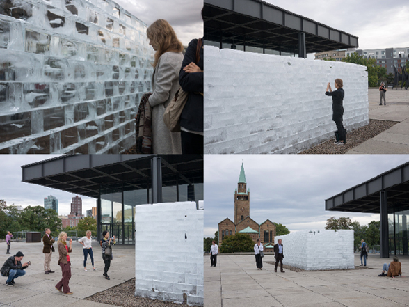 Die institutionelle Version hielt sich eng an die sogenannte „Score“ (dt. Partitur) Allan Kaprows, die sich auf dem historischen Ankündigungsposter findet, das zugleich als Aufruf galt: „During three days, about twenty rectangular enclosures of ice blocks (measuring about 30 feet long, 10 wide and 8 high) are built throughout the city. Their walls are unbroken. They are left to melt.” (...) Die skulpturale Form der Eisstruktur, an die geometrische Ästhetik des Minimalismus erinnernd, befand sich im Gegensatz zu traditioneller Kunst im öffentlichen Raum in jeder Sekunde in einem aktiven Zustand der Veränderung, der Bewegung, des Schmelzens, des Verflüchtigens.