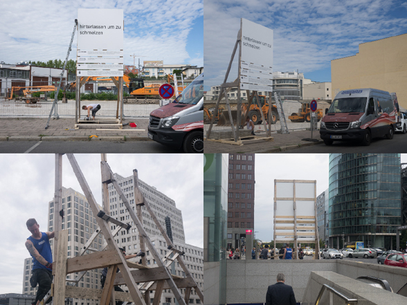 STADT IM REGAL reinvents the Happening FLUIDS from Alan Kaprow. Construction signs in the public space of Berlin cite words / word combinations of Kaprow's announcement of its original happenings 1967. The announcement included instructions for the erection of a rectangular enclosure, approximately 2.50 m high made of ice blocks. In the realized work ofSTADT IM REGAL, selected notions, freed from their previous descriptive context, become readable and imaginative scores for four different places in public space. Exhibition: 15th September to 8th November 2015, invited by Nationalgalerie Staatliche Museen zu Berlin, as part of the collaborative project STADT/BILD.