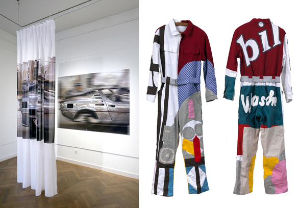 Autobody, 2022, Overall mit Stoffapplikationen, Kleiderstange aus Stahl, 200 x 168 cm