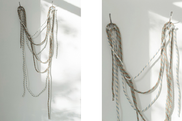 Vorhangkordeln, weiß-hellblau, grün-braun, je 6 m, verteilt auf zwei Garderobenhaken mit jeweils drei Aufhängern, Aluguss, poliert, 130 cm x 40 cm, Montagehöhe: ca. 175 cm.