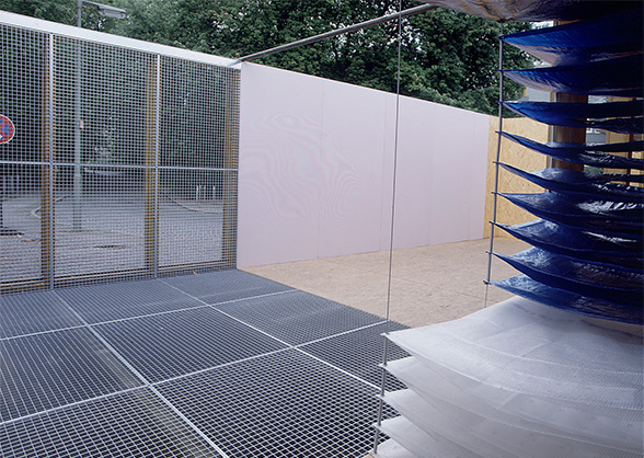 OSB-Platten, Kantholz, Schalungsträger, PVC-Folie (orange, blau, olivgrün, weiß), Stahlroste,-seile,-ösen, Zementfaserplatten (rubin E3), Bungalow: 21,50 m x 16 m x 3,20 m; collapse kitchen: 12,50 m x 9 m x 2,50 m |