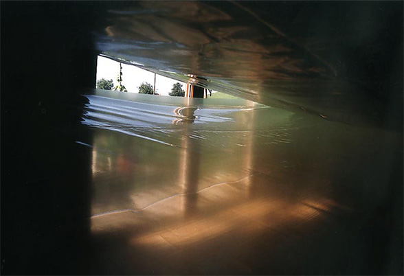 Der Ort ist charakterisiert durch eine langgezogene, steil ansteigende, in sich hügelige Wiese. Im oberen Bereich ein dichter Wald mit Nadelbäumen, im unteren Drittel ein Holzhaus mit zwei Räumen, ein Pflanzfeld und Obstbäume. Das Volumen des vorderen Raums, daß sich zum Garten öffnet ist im oberen Bereich mit fünf Lagen jeweils auf 4,00 x 3,50 m gefalteten hellgrünen durchscheinenden PVC-Folie aufgefüllt. Mit einem leichten Bogen hängt die Folie schwer und bewegungslos im Raum. Der untere Bereich, der normalerweise im Winter durch Eßzimmermöbel eingenommen wird, repräsentiert durch vier weitere Lagen PVC-Folie, wurde nach draußen auf die schräg gegenüberliegenden Anhöhe versetzt. Der Wind läßt die Lagen der Folie entlang der Faltung flattern.