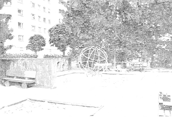 »Sandkasten, Gropiusstadt«, 2003, SW-Zeichnung, Buntstift, 1,50 m x 1,80 m
