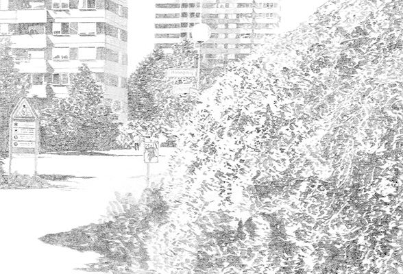 »Wiese, Gropiusstadt«, 2003, SW-Zeichnung, Buntstift, 1,50 m x 1,80 m