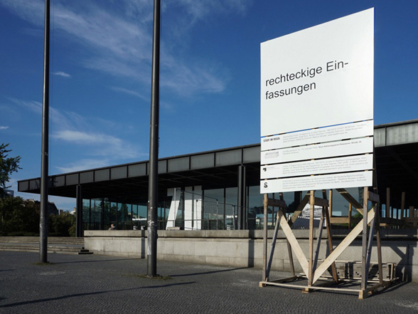 STADT IM REGAL reinvents the Happening FLUIDS from Alan Kaprow. Construction signs in the public space of Berlin cite words / word combinations of Kaprow's announcement of its original happenings 1967. The announcement included instructions for the erection of a rectangular enclosure, approximately 2.50 m high made of ice blocks. In the realized work ofSTADT IM REGAL, selected notions, freed from their previous descriptive context, become readable and imaginative scores for four different places in public space. Exhibition: 15th September to 8th November 2015, invited by Nationalgalerie Staatliche Museen zu Berlin, as part of the collaborative project STADT/BILD.