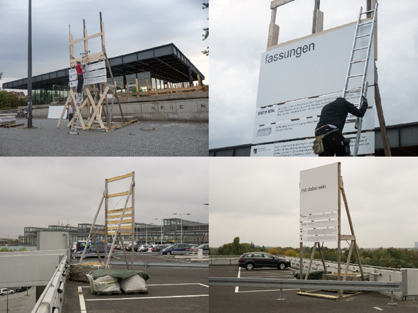 STADT IM REGAL reinvents the Happening FLUIDS from Alan Kaprow. Construction signs in the public space of Berlin cite words / word combinations of Kaprow's announcement of its original happenings 1967. The announcement included instructions for the erection of a rectangular enclosure, approximately 2.50 m high made of ice blocks. In the realized work of STADT IM REGAL, the singular notions, freed from their previous descriptive context, become readable and imaginable scores for four different places in public space. Exhibition: 15th September to 8th November 2015, invited by Nationalgalerie Staatliche Museen zu Berlin, as part of the collaborative project STADT/BILD.
