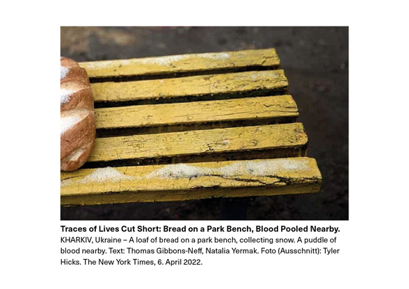 Geschnitten Brot 2023 Bank, NYT 6. April 2022, 2023, Holzlatten, Metallwinkel, Kabelbinder, 2,80 x 32 x 2,4 cm und Fotoprint (Traces of Lives Cut Short), 15 x 21 cm <<