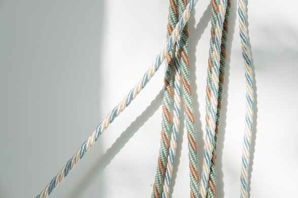 Vorhangkordeln, weiß-hellblau, grün-braun, je 6 m, verteilt auf zwei Garderobenhaken mit jeweils drei Aufhängern, Aluguss, poliert, 130 cm x 40 cm, Montagehöhe: ca. 175 cm.