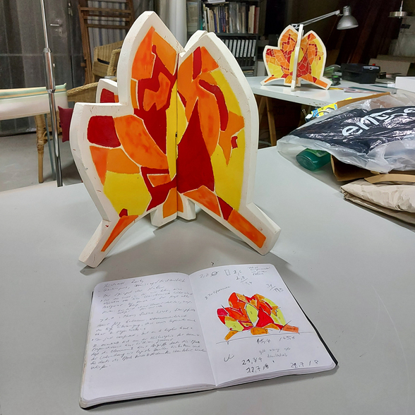 »Das Lagerfeuer als Bild und als Ritual spielte in der Sowjetunion bei Pionierlagern und Arbeitseinsätzen in weiter Ent- fernung von einem gewohnten Zuhause eine wichtige Rolle. Das Lagerfeuer diente als Gemeinschaft stiftendes Ritual u. a. in der Rekapitulation gemeinsamer Erlebnisse und Ergebnisse kollektiven Arbeitens. Fast die gesamte Fassade des Eingangsbereichs des Moskauer Pionierpalastes besteht beispielsweise aus einem durchgehenden Bildmosaik mit einem zentral platzierten Lagerfeuer. Der pavillionartige Pionierpalast wurde in der Chruschtschow-Ära von 1959 bis 1962 von einem Moskauer Architekturkollektiv (Viktor S. Egerjev, Wladimir S. Kubasow, Felix A. Nowikow, Boris V. Palui, Igor A. Pokrowski, Michail Khaschakian, Juri Ionow) gebaut. Über das Bild des Lagerfeuers gibt Ina Soboleva, die Tochter des Chefarchitekten von Selenograd Wladimir S. Kubasow, der auch am Bau des Moskauer Pionierpalastes beteiligt war, Auskunft: »Die Pioniere am Lagerfeuer, am Kasteur, das ist eine typische Ikonografie: Zusammensein, sich ausruhen, eine Pfeife rauchen, Lieder singen. Sich abends zusammensetzen: Das war für die Pioniere Tradition in der ganzen Sowjetunion. Der Leninkopf auf der rechten Seite des Mosaiks erinnert die Pioniere an die Ideen, die mit ihm verbunden sind. Auf der linken Seite, die Pioniere mit den Trompeten: Das ist der Aufruf zum Aufstehen, der Morgenappell zum Arbeiten.« Lagerfeuer, 2006, Ausschnitt Interview mit Ina Sobolewa, in: Birgit Schlieps:Aktau, Bildphänomene einer Plattenbaustadt in der kasachischen Steppe, Hamburg: Materialverlag HFBK 2020, Fn 3, S.109.